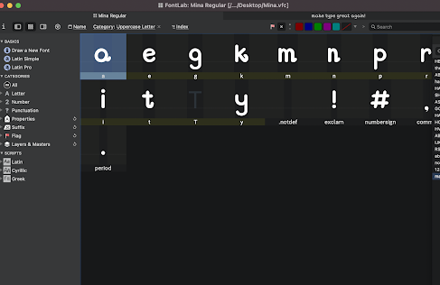 Working on task 3 was quite interesting to me. I learned how to create typefaces by using illustrator and Fontlab. This task has been an eye-opening experience for me. I used to not have a great interest in typography. To me, typography has always seemed like a subject that requires rules and techniques than creativities. However, this thought changed after experiencing typeface design through this task.